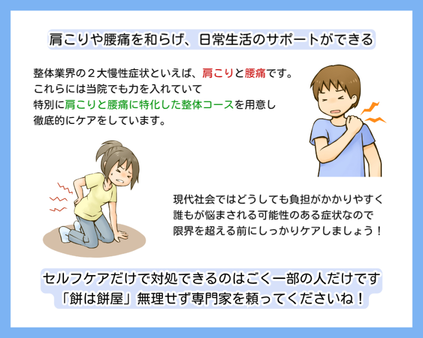 スポーツ障害の治療(特に肉離れ)・リハビリケア・スポーツのパフォーマンスアップ整体などのスポーツケアだけではなく、肩こり整体・腰痛整体などの慢性症状や一般症状に対するケアも充実しています。