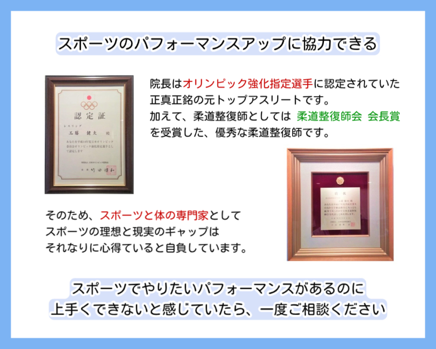 元オリンピック強化指定選手の経験を持つ院長が丁寧に施術します。